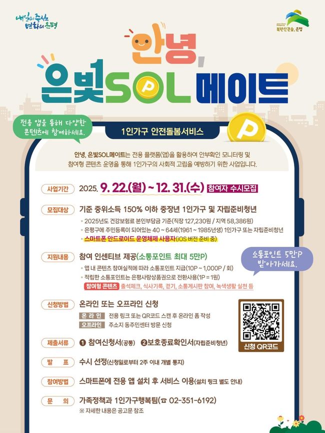 은평구, 1인 가구 안전돌봄 ‘안녕, 은빛SOL메이트’ 참여자 모집
