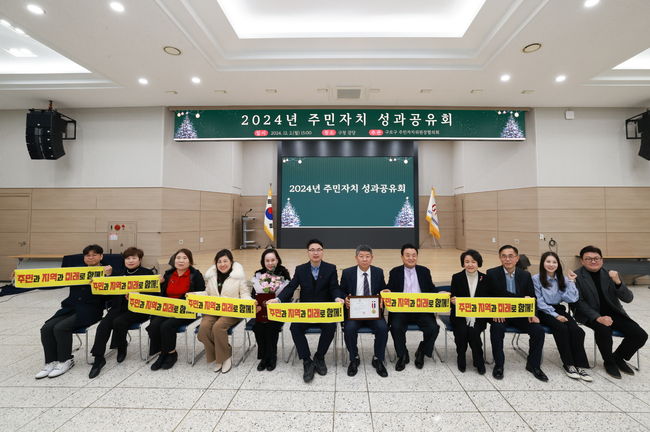 2024 구로구 주민자치 성과공유회 기념사진.구로구(구청장 장인홍)는 오는 17일 오후 2시 구청 강당에서 구로구 주민자치위원장협의회 주관으로 ‘2025 주민자치 성과공유회’를 개최한다고 밝혔다. 이번 성과공유회는 한 해 주민자치 활동을 돌아보고 서로의 노력을 격려하며 생활 자치의 기반을 강화하기 위해 추진됐다.